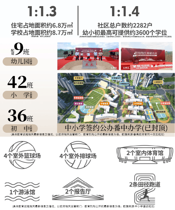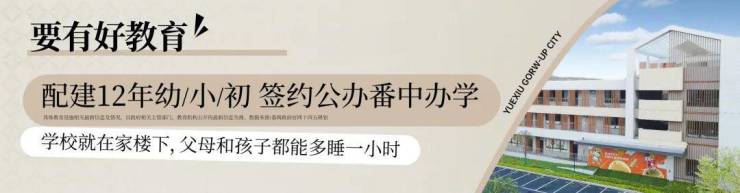 项目最大的优势就是楼下12年全龄教育,均是开发商配建的。有9班幼儿园,42班小学36班初中,中小学引入公办番禺中学办学。而且,目前也开学了!