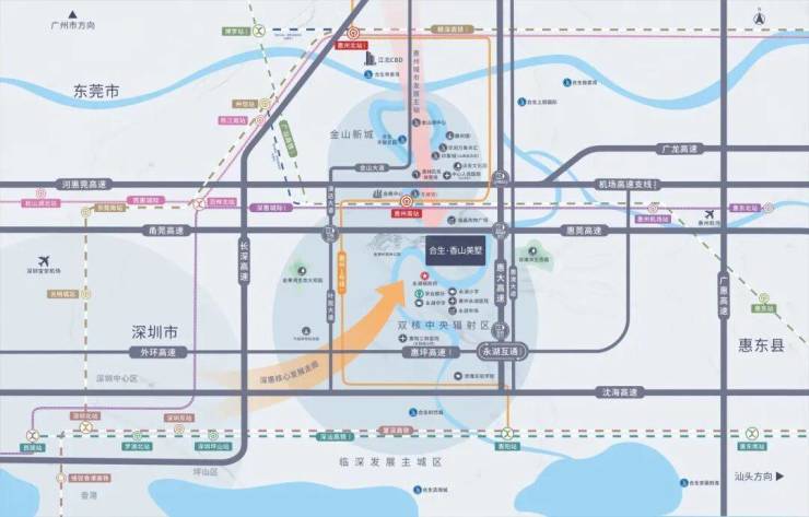 三轨道:即广汕高铁、深惠城轨、惠州地铁1号线,都汇集于惠城南站(已更名为惠州南站),离我们项目约8公里,10分钟车程。