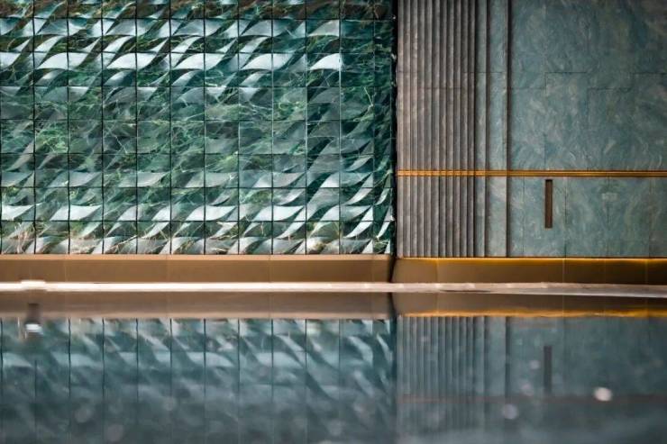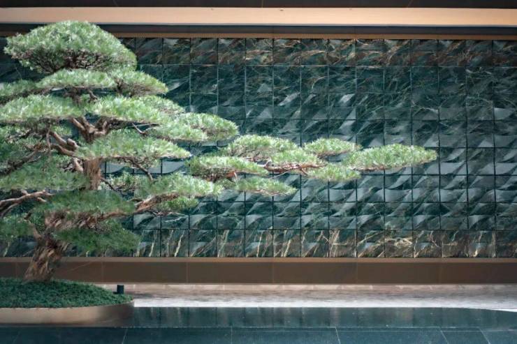 这种材质一般只在高档会所、豪宅上做一些点缀,而都荟天珺整整做了一整面墙!