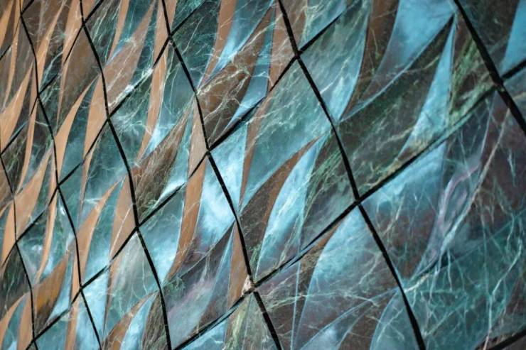 比如落客区大面积铺贴的Prada绿大理石,需要从选材、色彩、雕刻工艺等全方面的把控。