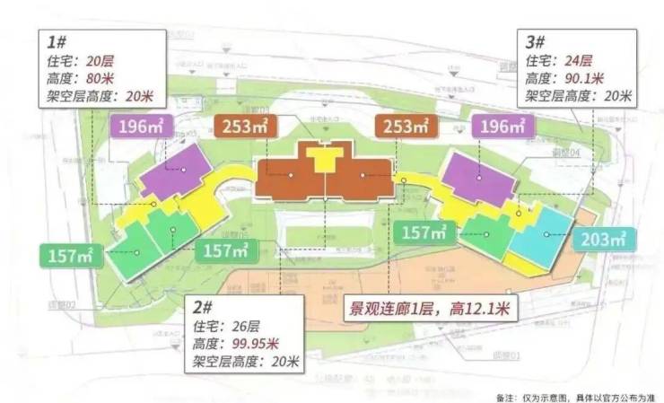 中间2栋为楼王单位,26层高,两梯两户,户型全部为253平大平层,层高达到3.3米。
