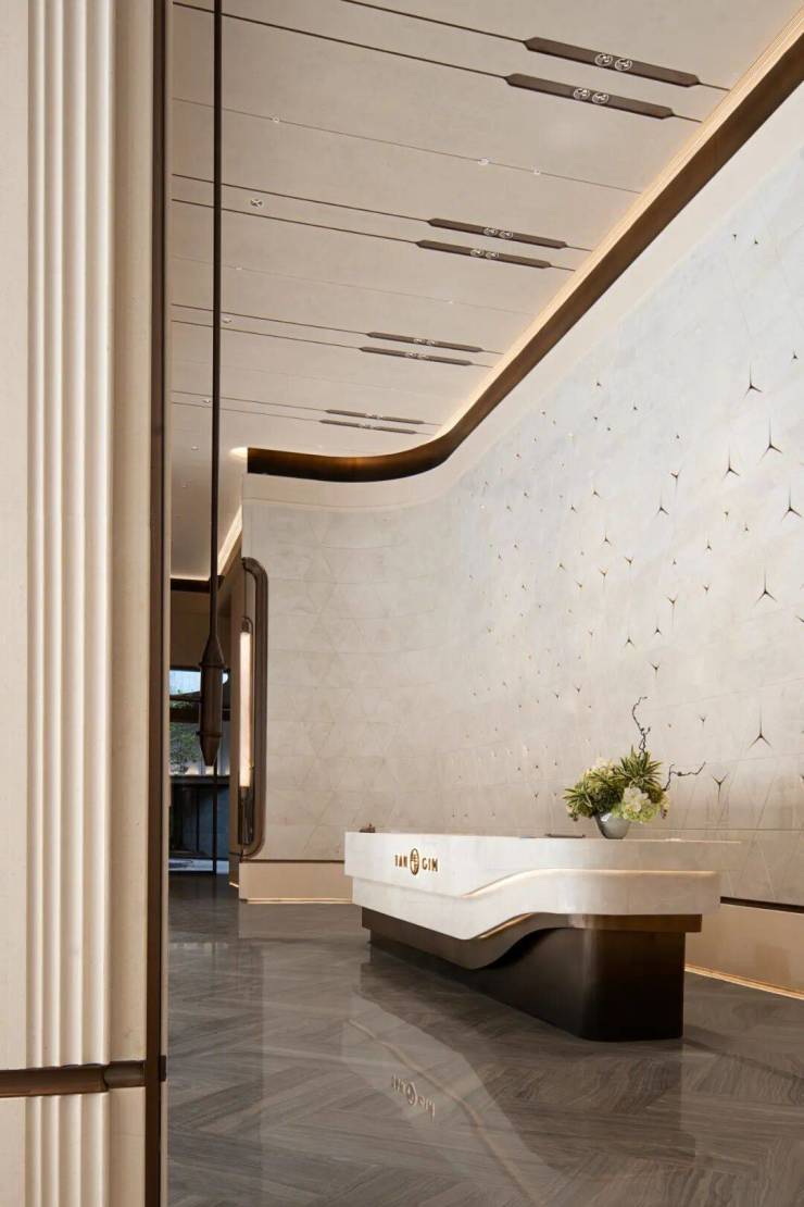 整个大堂背景墙长约40米,整体由色白而通透的皇家白玉奢石铺就,富丽堂皇的贵气,扑面而来。
