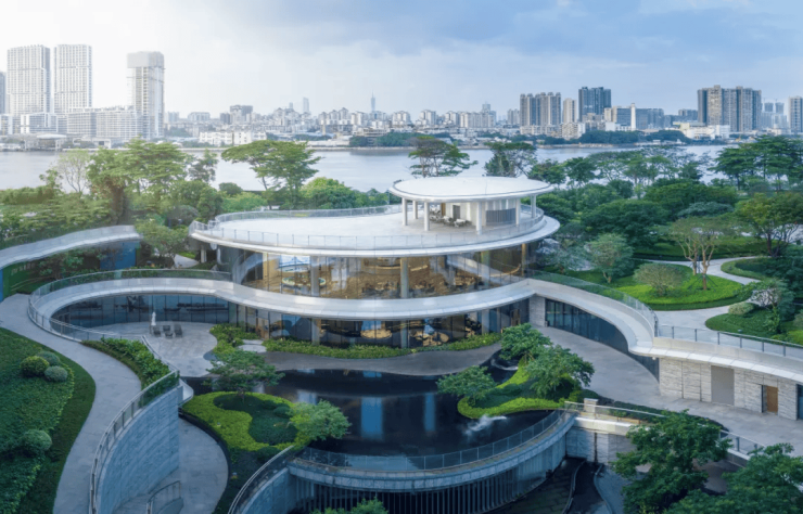 在立体下沉式叠瀑庭院中央,设计团队构筑了约3000m²的星环会所,精巧融合活流静水、珠江银河、日光星辰的概念。