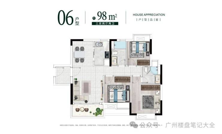 98㎡三房两厅两卫实用三房户型×带人户花园×南向观景大阳台×阔绰主卧套间
