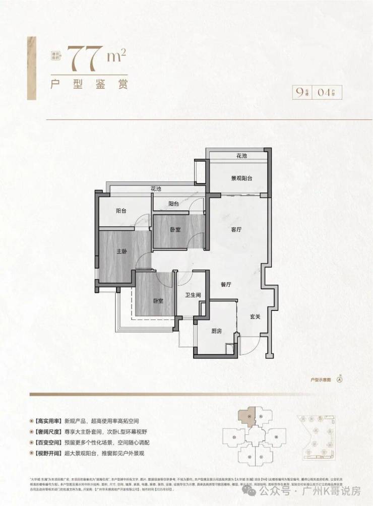 • 77㎡3房2卫(无敌视野景观):买77㎡,相当于旧规90平的使用感,小投入拿下够大的家;