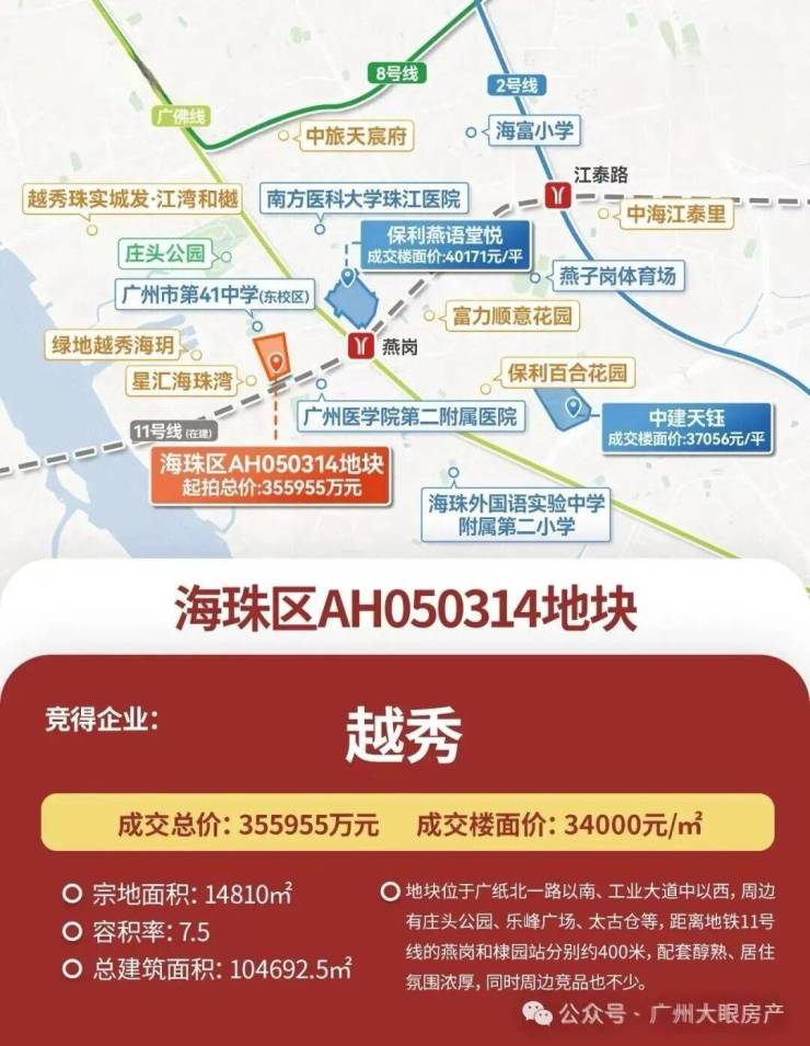 广纸314地块在2024年9月19日出让,越秀以楼面价3.4万/㎡、总价35.6亿元拿下,该地块体量不大,占地面积14810㎡,出让面积13959㎡,总建面约104693㎡。