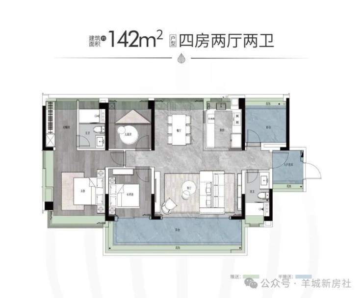项目主打建面约125-142㎡南向瞰江四房,设计以“江景最大化+空间效率”为核心: