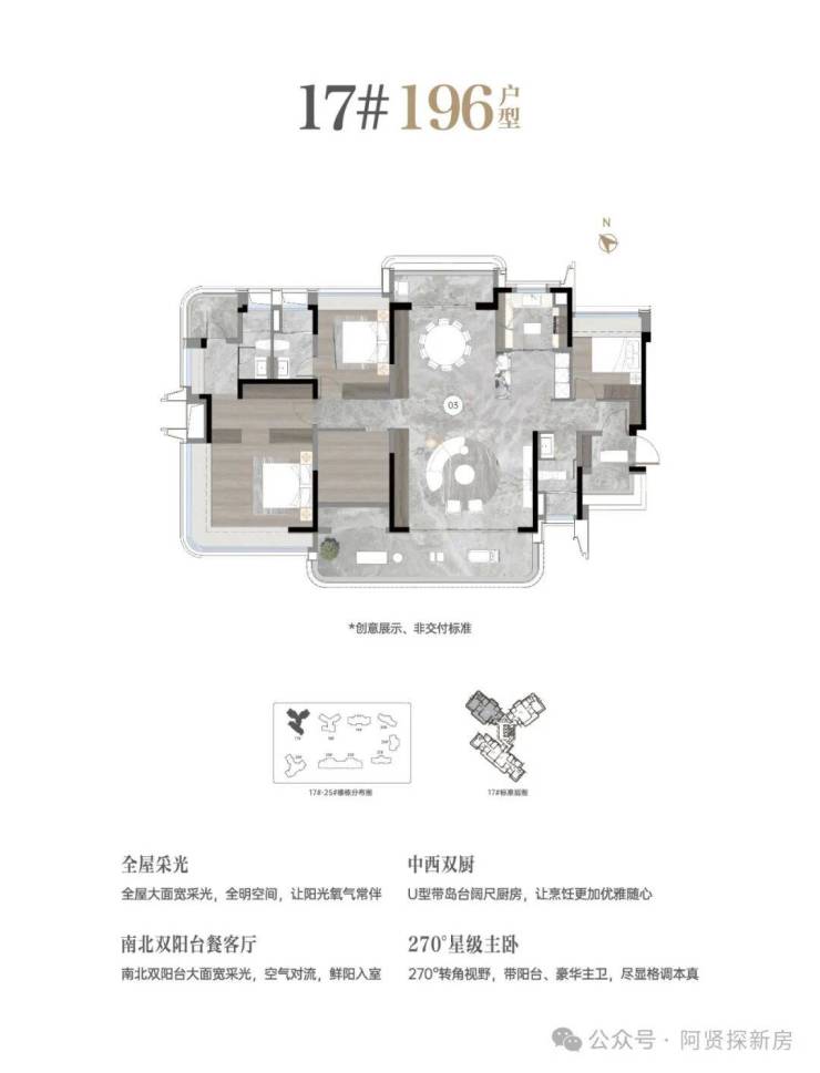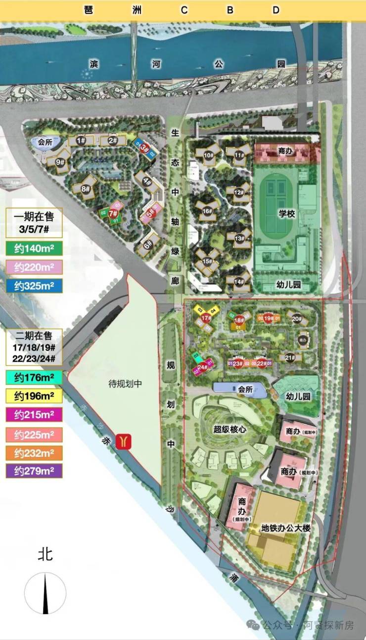 ——基本信息——【项目规模】占地共约24万m²/建面约98万m²【项目业态】24栋住宅、多栋商办,配建托儿所、幼儿园及中小学【项目户数】住宅共约1780户【在售产品】二期住宅17-24#176-279㎡新派科技豪宅