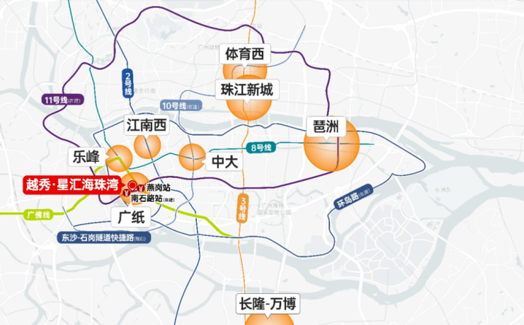 项目位于广佛线燕岗站与广州11号线(在建 )贯穿项目,广州首条环城地铁,0换乘直达琵洲、广州火车站、广州东站;距广佛线燕岗站约450米,接入3号线,7站到达珠江新城;更有海珠环岛有轨电车(规划中)