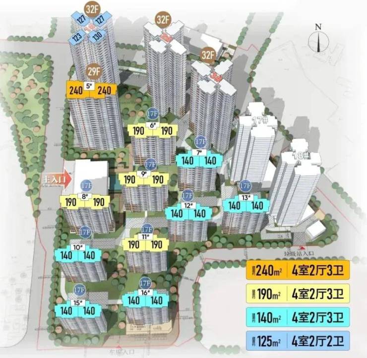 包含:①11栋纯T2板楼设计,其中有10栋楼均为17层小高层,户型为140平和190平四房两厅三卫户型,仅一栋楼为29层T2设计,户型为240平四房两厅3卫户型;②3栋32层T4塔楼设计,户型均为125平四房两厅两卫;③另有2栋28层高T5安置房。