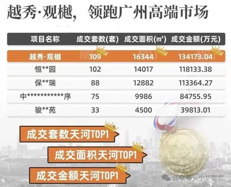 特别是越秀·观樾3月首开成交15亿,这在当时冷淡的市况下尤为难得,由此一炮而红,迅速打开市场。接下来,五一热销约5亿;端午热销约3.6亿;7月加推1栋当天去化超5成……4开4捷,几乎是霸榜广州豪宅热销战绩,堪称“断货王”。据克而瑞数据统计,首开以来,项目斩获天河区1000-1600万总价段的"三冠王"(涉及套数、面积、金额成交),挤进天河“高端局”顶端。