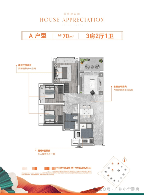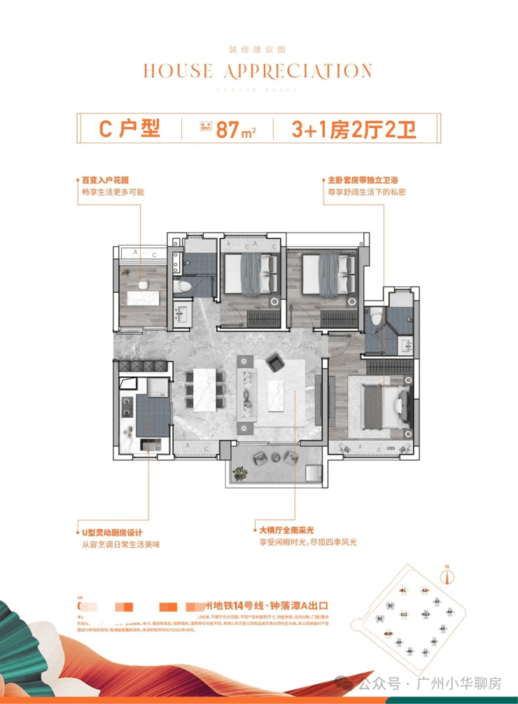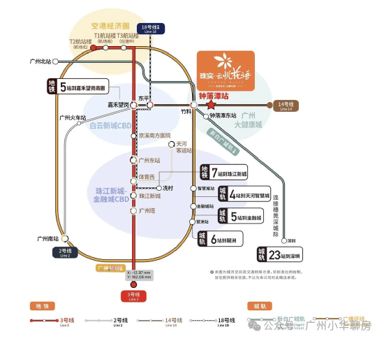 项目位于地铁14号线钟落潭站旁,距离大概1000米,5站到嘉禾望岗,换乘2、3号线可直通白云新城和畅达广州全城;