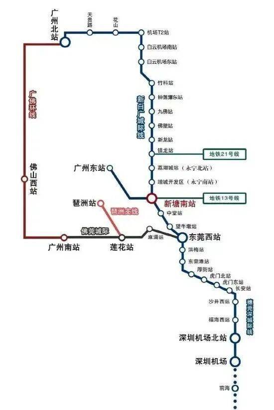 新白广城轨(在建中)1站白云机场,南向通达东莞和深圳。