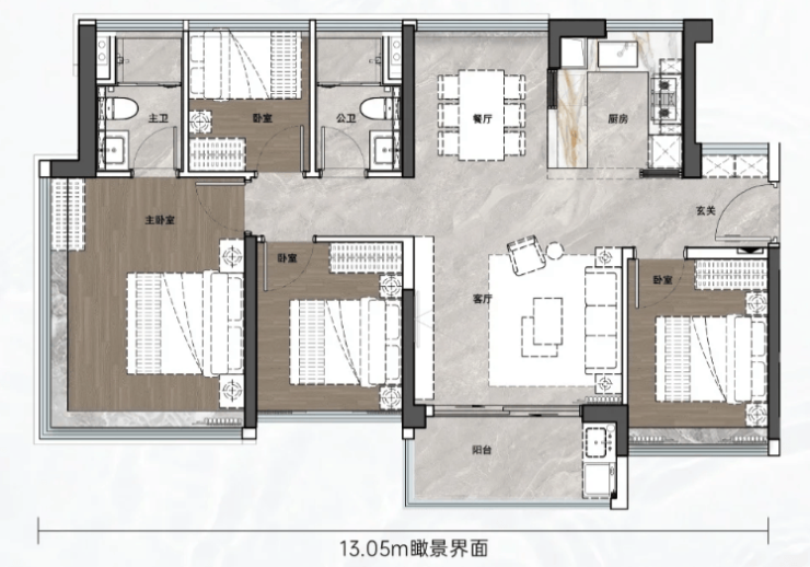 建面97㎡的对流单边四房,全景观园,超13米南向采光。