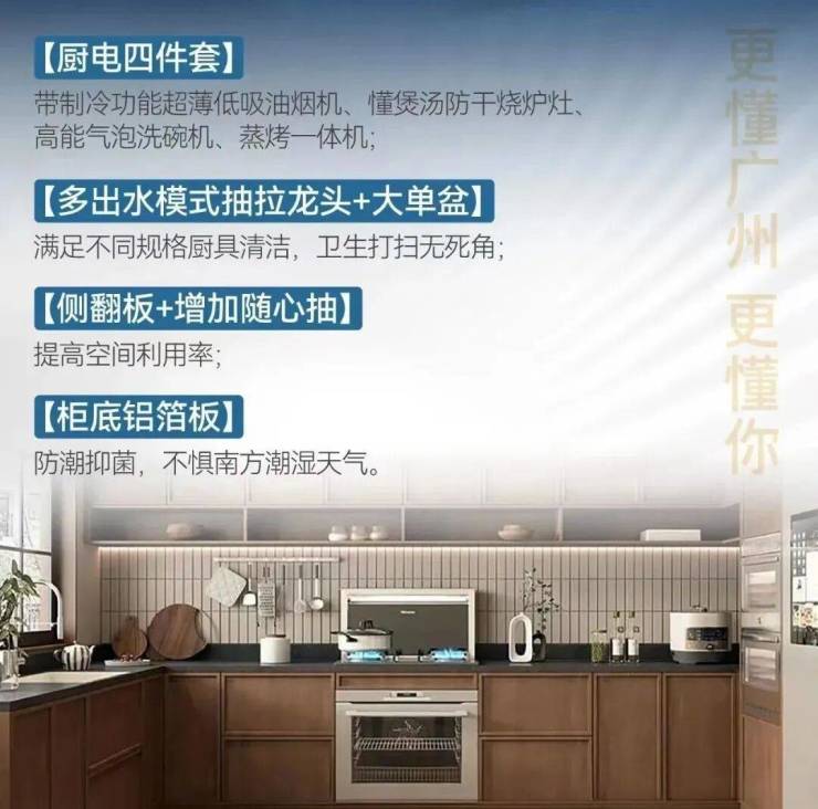 项目在交标备餐方面,设创新广式厨房其一,优化厨房空间功能不但优化了“洗-切-炒”高效厨房动线,同时实现了岛台高低台设计,集防坠落、双面收纳、定制薄柜等多元功能于一体;其二,实现广式交付标准如厨电四件套、多出水模式抽拉龙头、大单盆等,有效应对油烟、清洁等各种厨房难题。