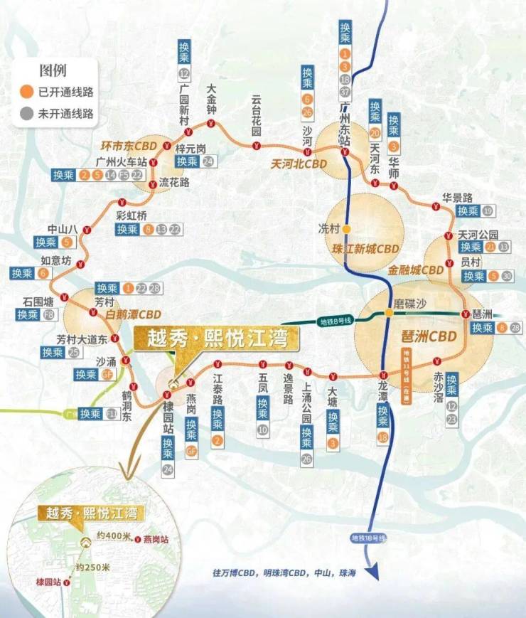 项目距离广佛线燕岗站直线约400米,步行大概需要600米左右,走去地铁站约10分钟左右,距离11号线棣园站直线约250米,步行需要600米左右,大概8分钟左右,算是个妥妥的双地铁盘,均可不换乘直达珠金琶。