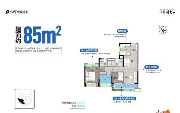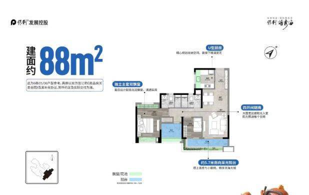 保利领秀海推出一期74-170平方米三到四房以及二期63-82平方米三房户型,所有户型均通过巧妙设计实现高实用率,最高可达107%。具体户型如下: