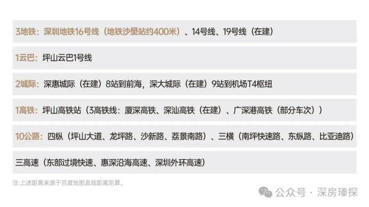 自驾出行方面:南坪快速出入口距离约1.5公里,15分钟可达龙岗中心城,1小时内可覆盖南山、福田等核心区域。项目规划300个地下停车位,车位比1:1.41,配备充电桩,满足新能源车主需求。通过地铁+云巴+公交的多维交通体系,实现了与深圳各核心区域的高效连接。