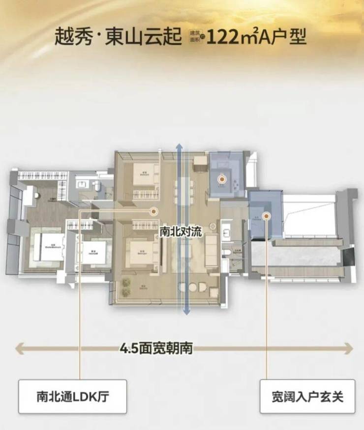 122平米户型采用横厅布局,全屋南北通透,还附赠了一个相当大的归家长廊,可以当做收纳空间。