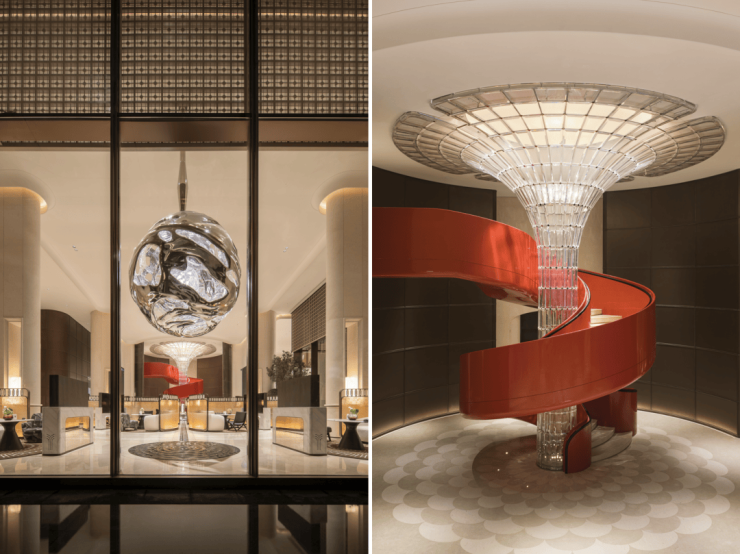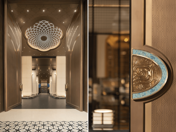 二进院“水境回廊”,将令人惊叹的“文化浓度”融于空间。六扇瑞兽纹墙以岭南剪纸工艺呈现,象征“六合天地”;两吨重约7.5米高鎏金铜门,由非遗大师朱炳仁锻造。