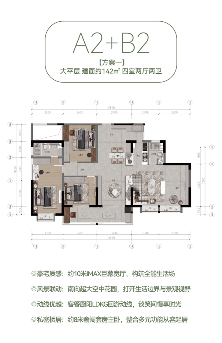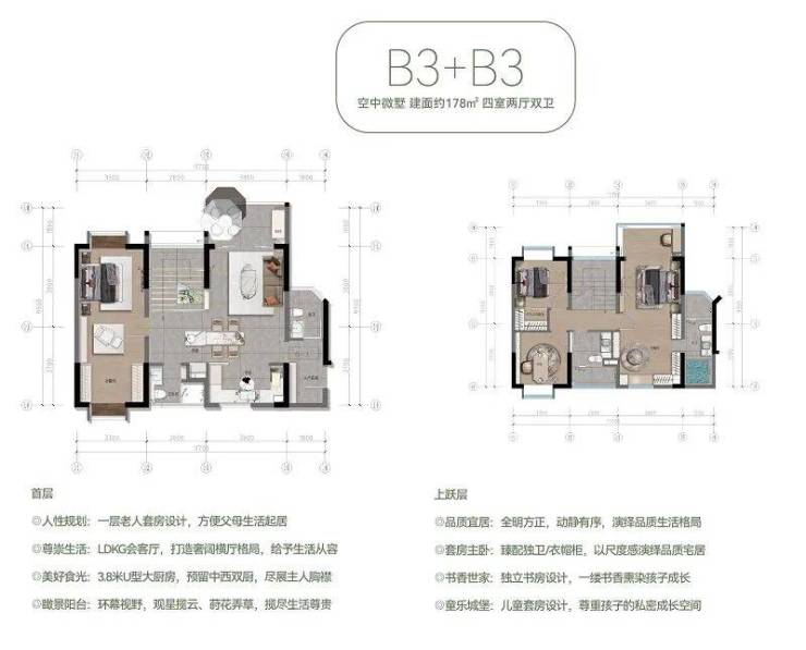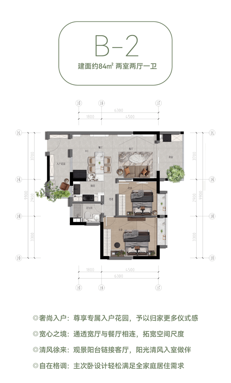 具体来说,A-2户型(建面约60㎡)以独立入户花园和客餐厨一体化设计,打造宜居范本;B-2户型(建面约84㎡)则通过通透宽厅和观景阳台,让阳光清风入室做伴;B3奢阔大平层(建面约89㎡)以高得房率和阔绰宽境,提升居住品质;A-2+B-2大平层(建面约142㎡)则通过豪宅质感和私密有序的设计,满足家庭成员的多元需求;而B-3+B-3空中微墅(建面约178㎡)更是以人性规划和品质宜居的设计理念,打造出一处尊贵的居住空间。