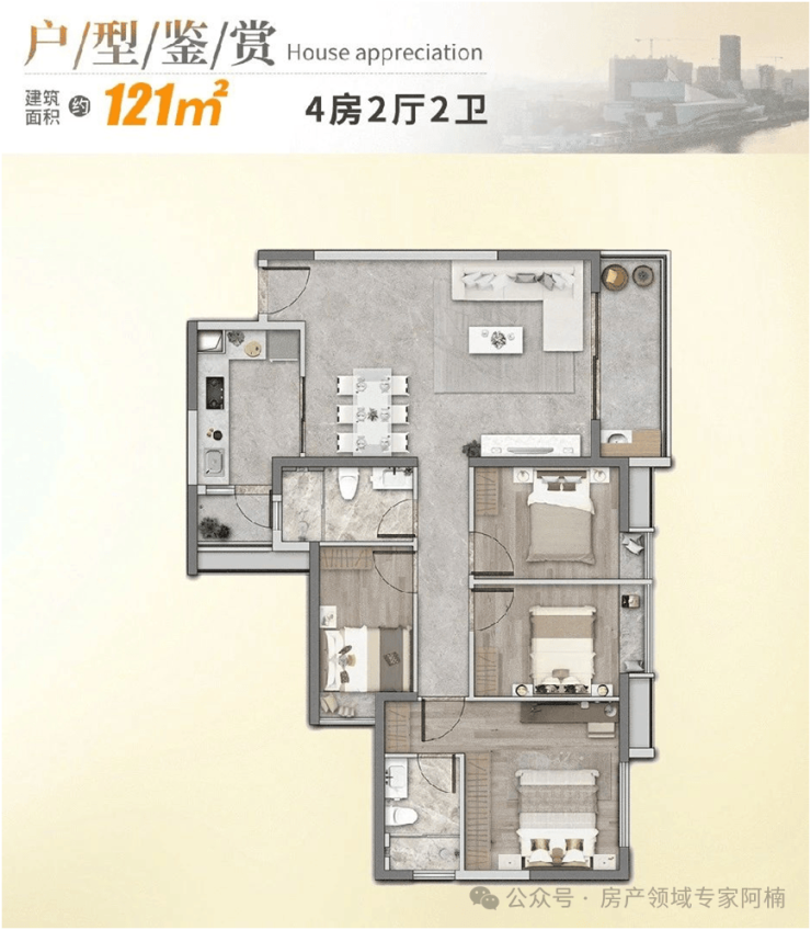 建面约121㎡天幕四房,东南朝向、四房朝阳,每间房都能感知江幕与阳光共舞的美妙。约4.5米的超阔客厅,巨幕采光面,也让每寸江岸时间都泛着优雅波光。