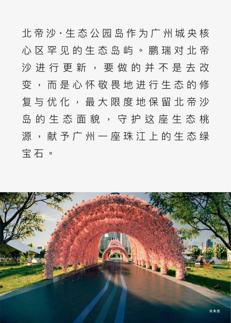 鹏瑞集团还取得了珠江江心岛北帝沙岛的经营权,这座与鹏瑞1号对望的岛屿将被打造成世界级的江心生态岛,为业主带来独特的体验。未来,北帝沙岛将打造集生态环保、文化娱乐、保育教育、农耕体验于一体的多元健康生活场景,带来文化、旅游、休闲生活新体验