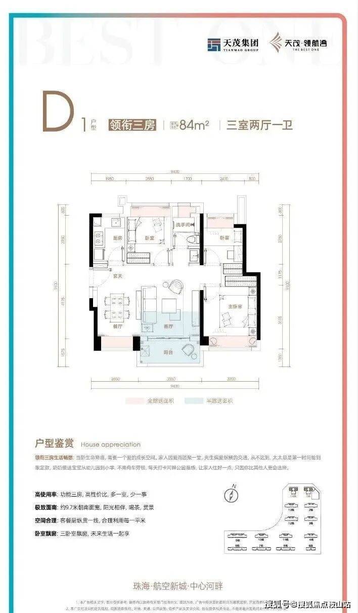 天茂领航湾坐落于珠海金湾航空新城核心,地处金河东路南侧、金泓路西侧,由珠海华茂智城置业发展有限公司开发,是天茂集团布局粤港澳大湾区的首著之作,定位刚需与刚改宜居社区,精准适配各类家庭需求。项目总建面约11.8万㎡,规划14栋纯板楼,总户数894户,容积率2.35,绿化率35%,以“候鸟·栖息”为理念打造景观园林,紧邻中心河湿地公园,坐拥一线滨河生态景观。