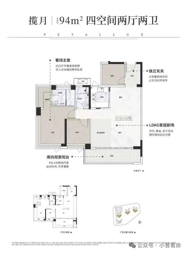 - 94㎡四房两卫:LDKG一体化厅堂+6.4米南向阳台,适合二胎家庭。