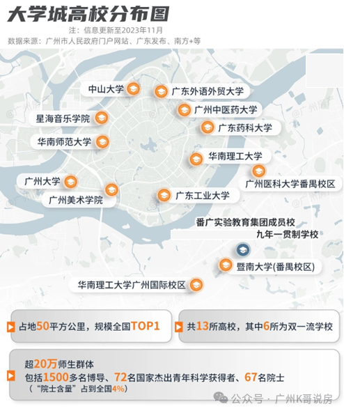 智识高地,同质而居:与暨大、华工国际校区为邻,13所高校环绕、约20万师生聚集,高知人才的聚居地。