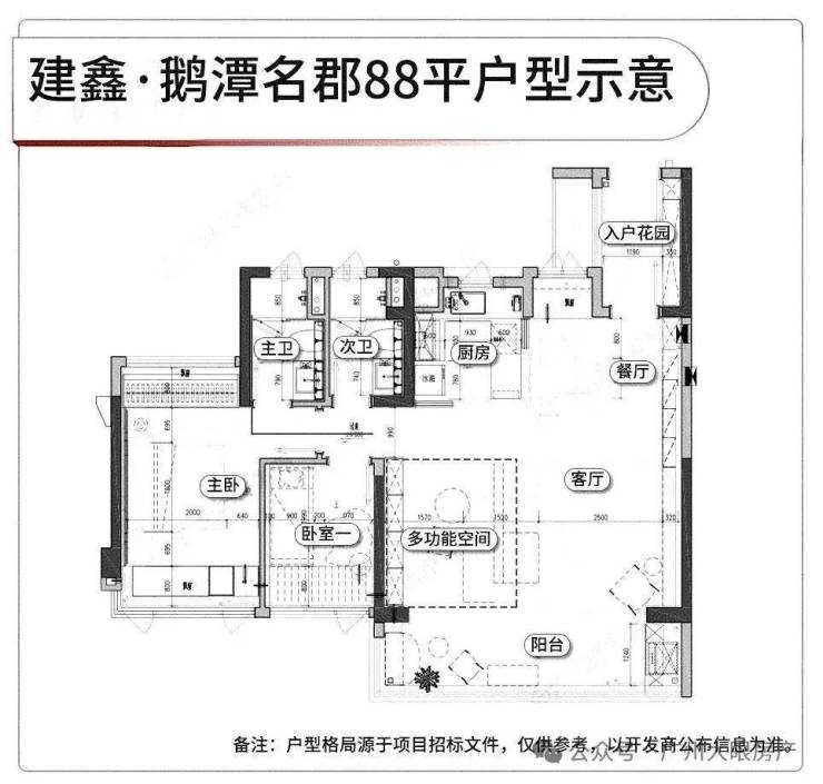 整个社区采用围合式布局,中间有大片园林。货量预估900+套,体量不算大。项目将打造三个样板间,分别是建面约88、105和125平。