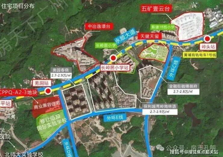 中冶·逸璟台位于广州市黄埔区长岭街道岭头社区长岭路,紧邻永顺大道,处于长岭居的核心位置。该地块CPPQ-A2-1在2016年8月被中冶置业以总价约36.8亿元拿下,楼面价约为2.7万元/平方米,溢价高达241%,成为当时的“黄埔地王”。