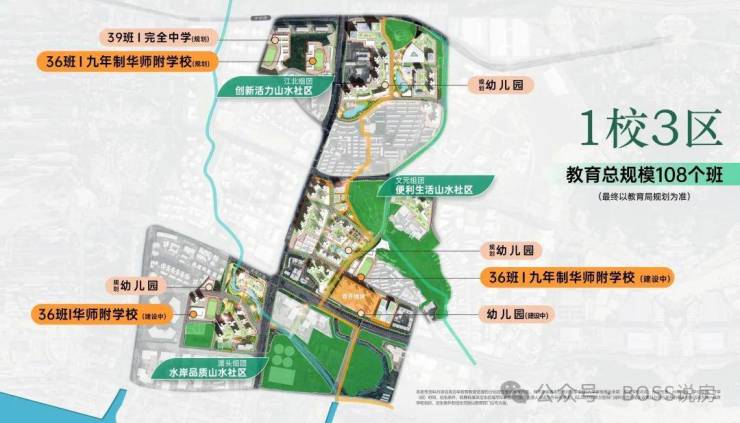 校名初步确定为“华南师范大学附属高新区实验学校(暂定)”,配置3个校区,预设总规模为108个班(最终以教育局规划为准),形成连点成面的教育矩阵布局。