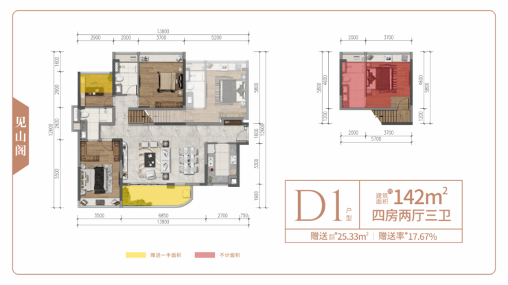 优点:最高楼层17楼,三梯两户,南北通透无遮挡看山景,赠室内面积高达35平,🚩实用率高达105%🚩