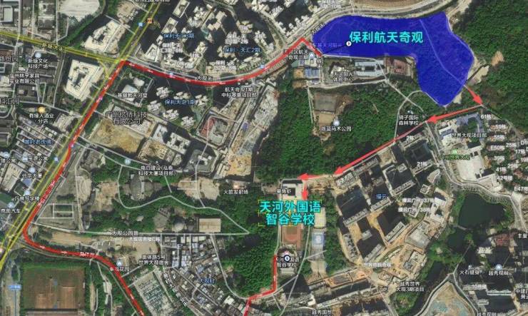 项目自身配建6班幼儿园,中小学由天河外国语智谷学校(已开学)统筹解决