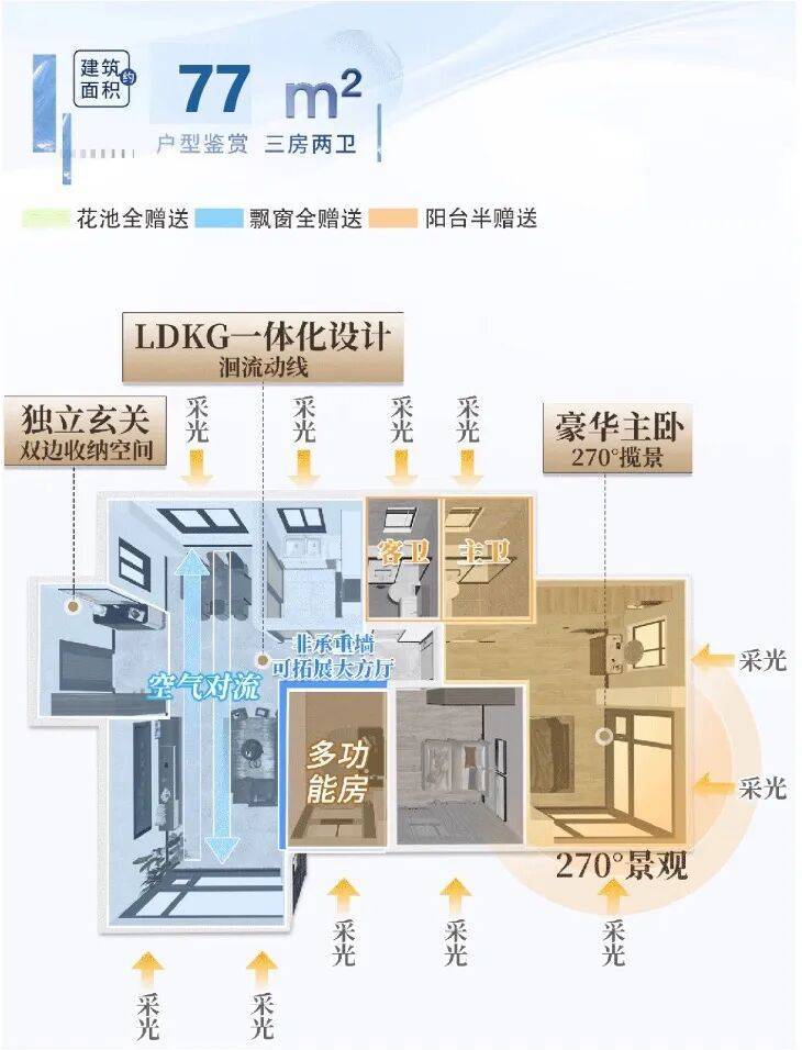 新规产品,将空间发挥极致,建面约77-91㎡三四房,全双卫设计,打造南北通透低密精奢小户,真正做到高赠送高使用