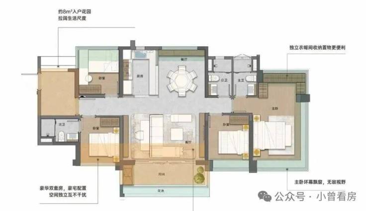 建面130平四房,LDKB大方厅,客厅就有57平,还做了双主套设计,豪宅的配置互不干扰。