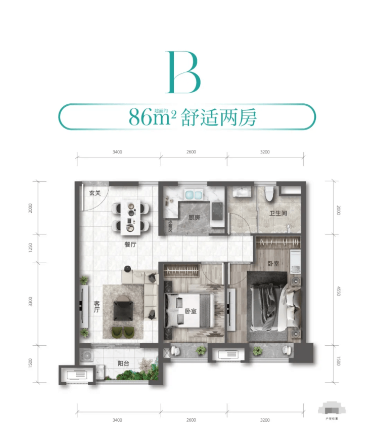 建面约 :86-93m² 两/三房