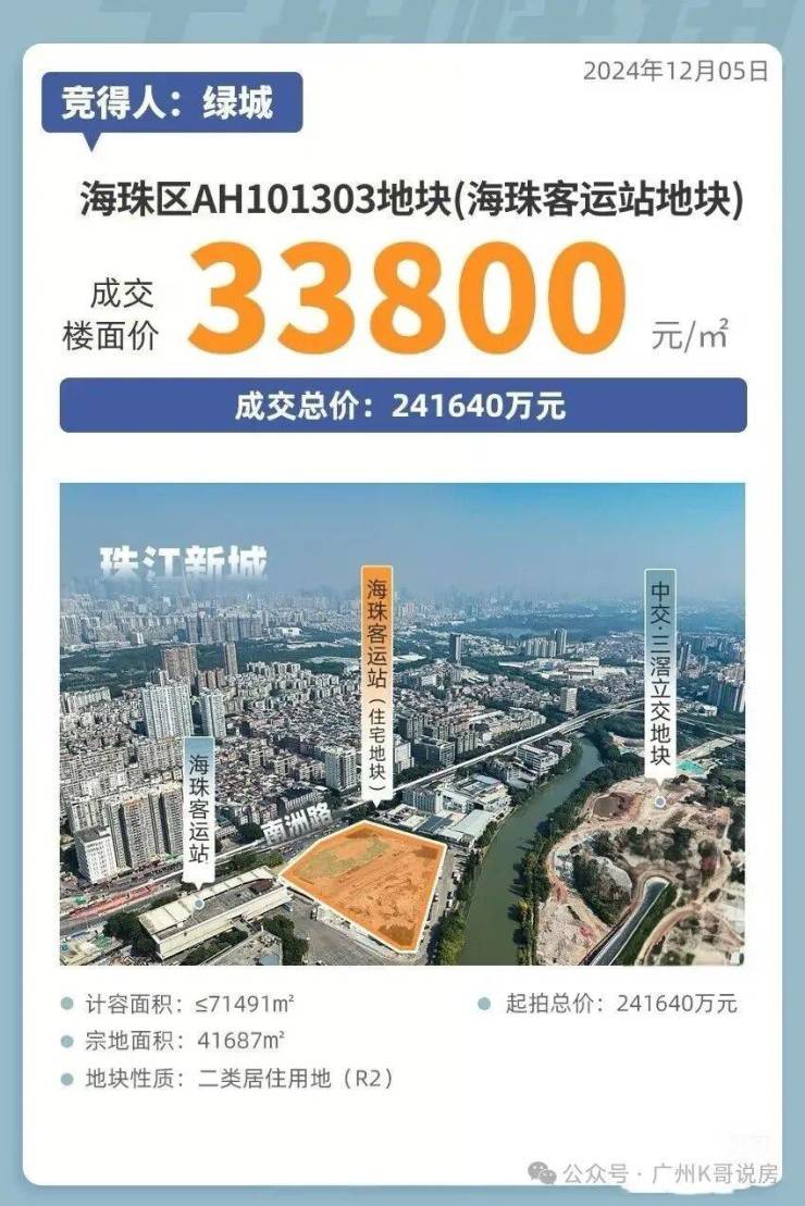 2024年12月5日,绿城拿下海珠客运站地块,总价24.16亿,楼面价3.38万/平。(未扣除配建)
