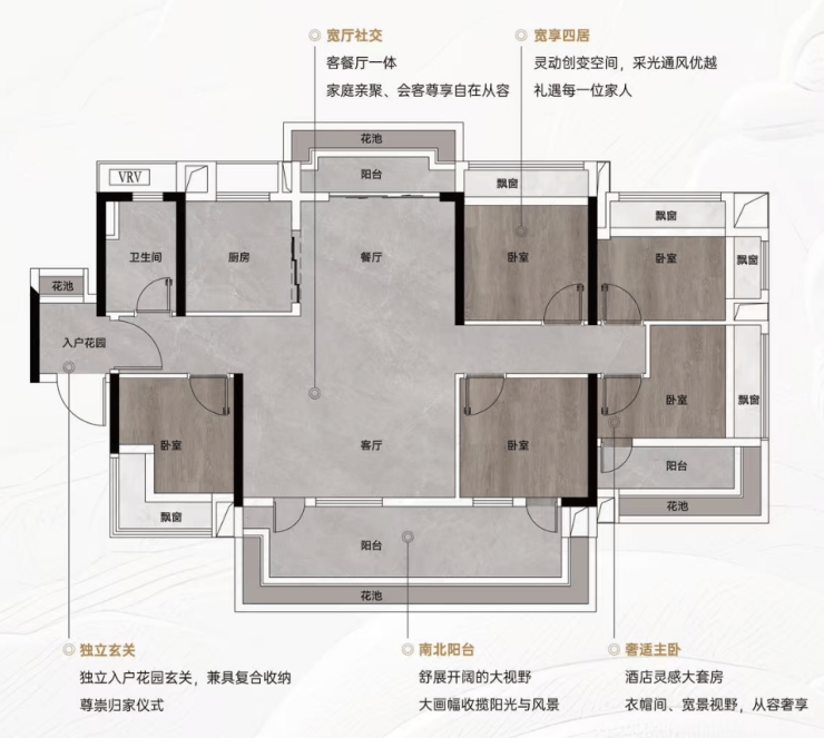 是个南北对流的户型,四开间朝南。南面做了宽阳台的设计,加上花池的赠送,空间阔绰;北面餐厅报备了花池,可做餐边柜摆放杂物形成对流。