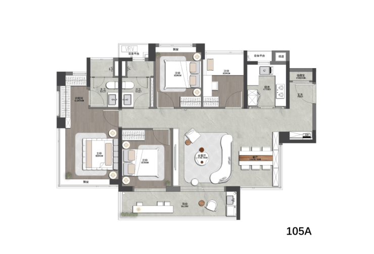 建面约105平户型,四开间构筑约12.8米南向面宽,带来超强通风、全明采光。