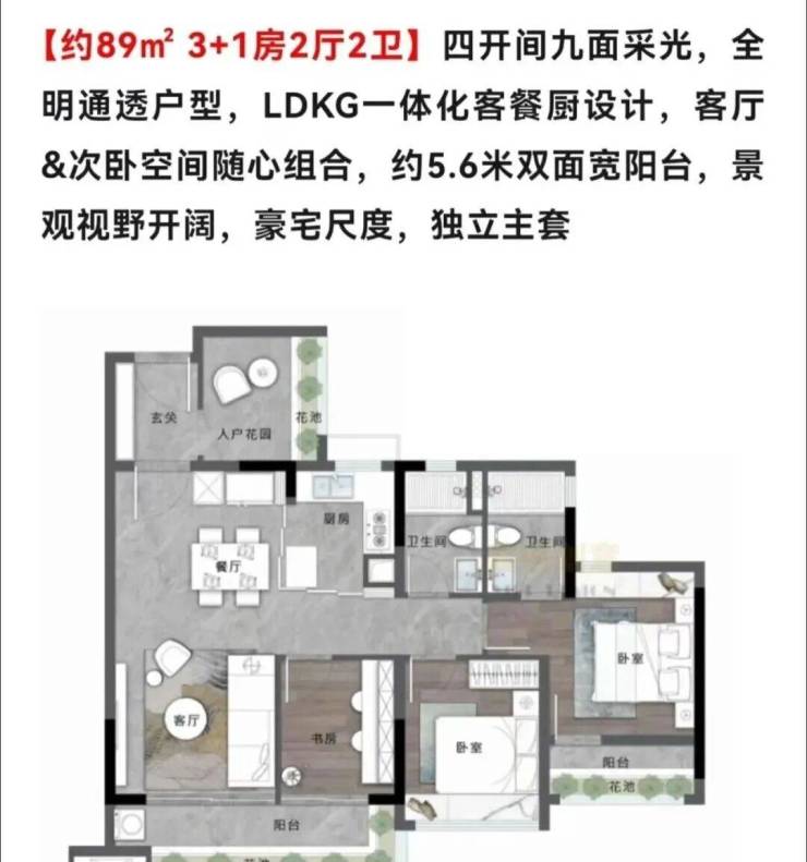 3、高实用率户型:最小户型78㎡起,主打刚需户型设计灵活,LDKG一体化客餐厅、双面宽阳台等设计,实用率超100%,赠送面积多。