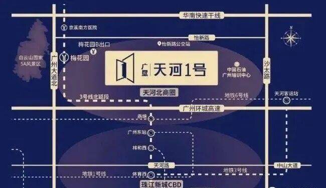 位于广州天河怡新路,距离广州地铁3号线梅花园站B出口仅约几百米;雄踞天河CBD 中轴线上,项目以“献给天河CBD的中轴资产”为定位、以“地铁口物业”+“城市综合体”的双赢模式打造,力图再造一个天河CBD中轴资产项目。