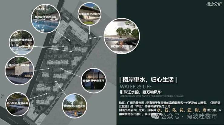 豪宅园林缔造者上海朗道景观规划设计有限公司,从刻画雨后珠江之景的《雨后珠江登望》中提取水、石、鸟、花、云、树、舟的自然元素,以现代的设计展现自然景观的惬意意境之美,为高净值人群的生活体验和使用需求提供顶级生活范本。