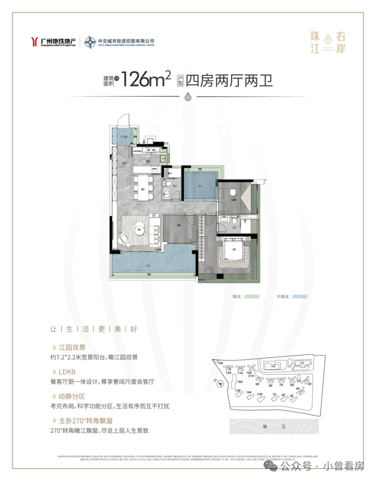 126平竖厅户型,也是拥有约7.2*2.2米的宽景阳台,可望江园双景。
