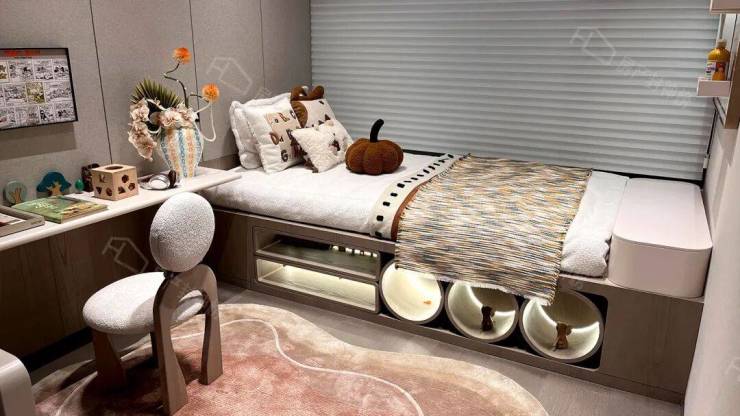 北向次卧,儿童房,榻榻米设计,留出更多空间放置书桌、衣柜。