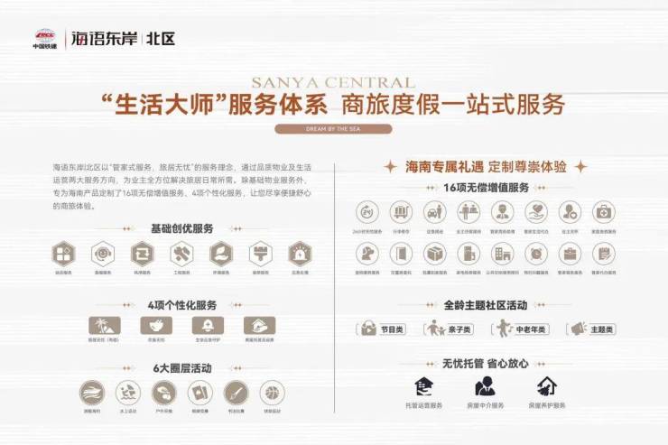 中国铁建自持物业,国家物业管理一级资质。除基础物业服务外,专为海南产品定制16项特色服务,尽享便捷舒心的商旅体验。