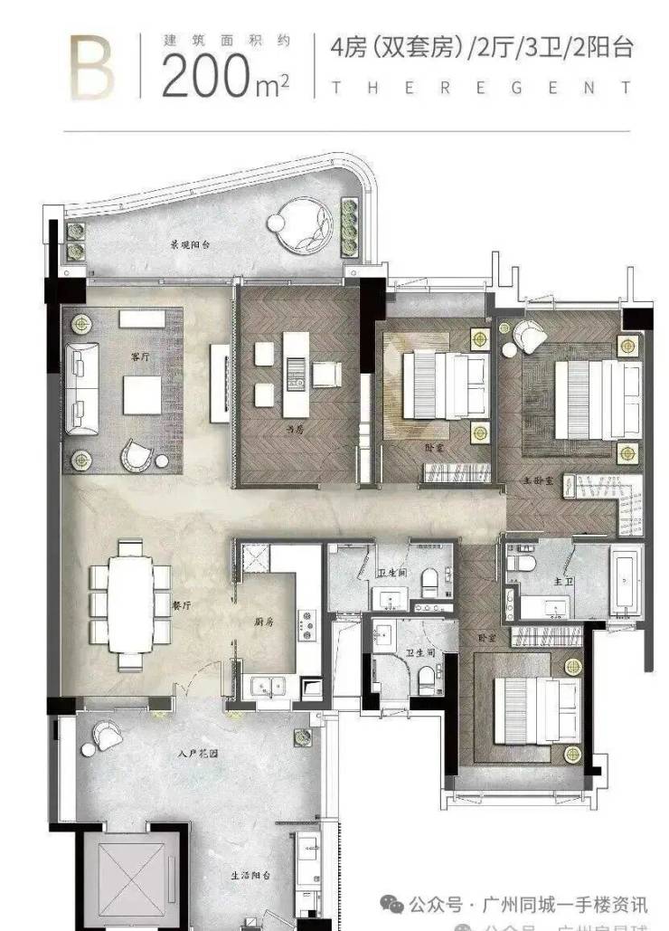 建面约200㎡:4房(双套房)2厅3卫2阳台私属电梯入户