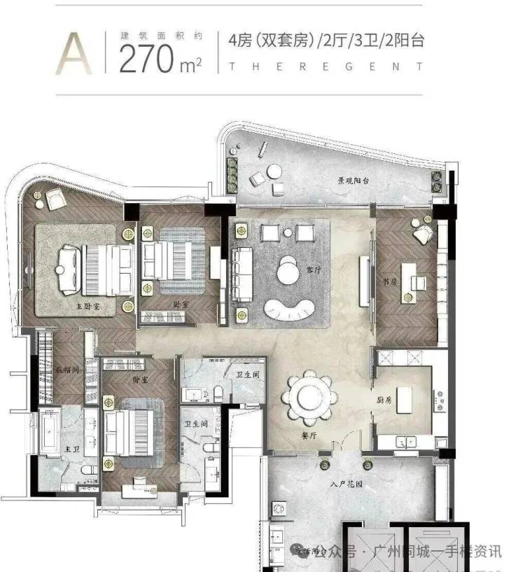 建面约270㎡:4房(双套房)2厅3卫2阳台独立电梯入户