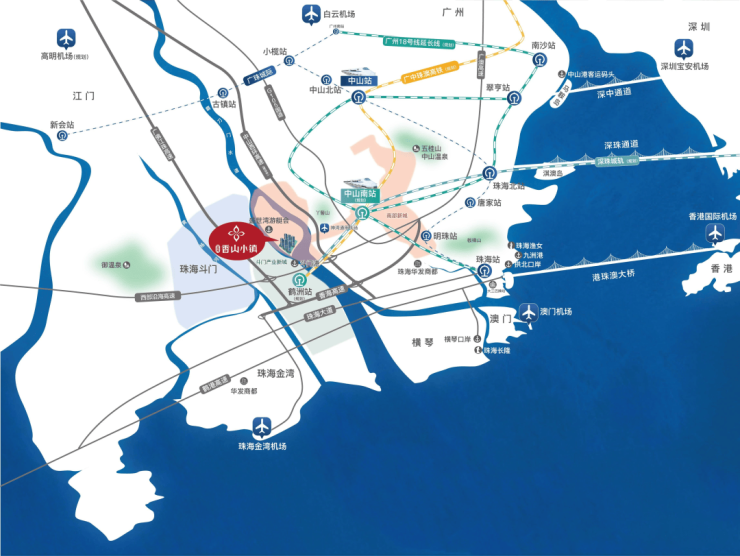 藍城·鷺島香山小鎮坐落中山第二大島,距離珠海香洲主城僅35分鐘車程,35分鐘達珠海金灣機場,25分鐘至中山南站、珠海鶴洲站